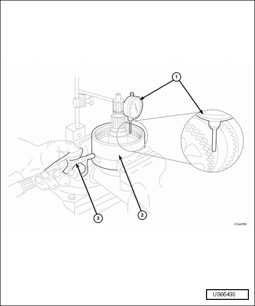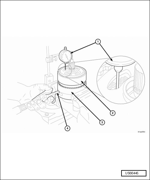 - Using a dial indicator and air pressure, measure the direct clutch clearance, the clearance should be between 0.95 to 1.41 mm (0.037 to 0.056 in). Install the desired selectable reaction plate to achieve the correct clearance.