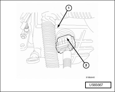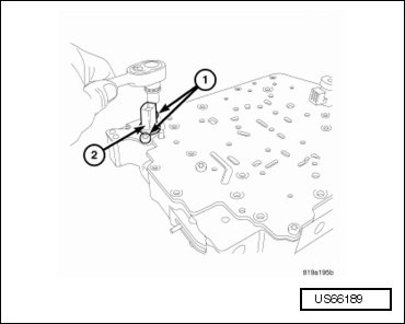 - Disconnect the solenoid pack electrical connector (2) at the valve body oil pan (1).