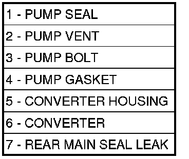 Some suspected converter housing fluid leaks may not be leaks at all. They may only be the result of residual fluid in the converter housing, or excess fluid spilled during factory fill, or fill after repair. Converter housing leaks have several potential sources inspect pump seal (1), pump vent (2), pump bolts (3), pump gasket (4), converter housing (5), converter (6) and a rear main seal leak (7). Through careful observation, a leak source can be identified before removing the transmission for repair.