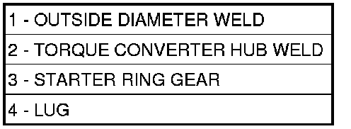 • Torque converter weld leaks at the outside diameter weld (1).