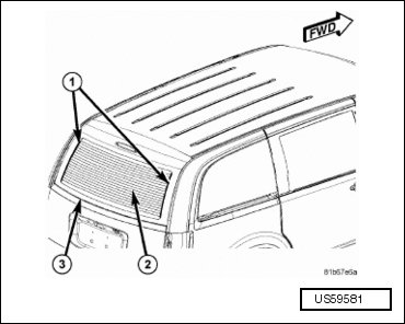 The rear window defogger system, also known as Electric Backlight (EBL) system, consists of two vertical bus bars (1) and a series of grid lines (2) fired onto the inside surface of the rear window (3).