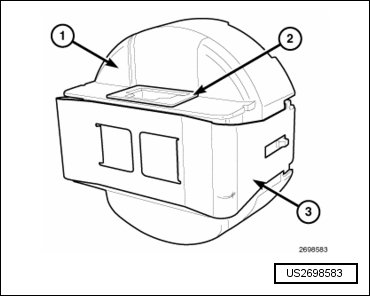 The Light Rain Sensor Module (LRSM) (1) is the primary component of the automatic wiper system. In vehicles equipped with the automatic wiper system and the automatic headlamp system, the LRSM also performs the ambient light sensor function; and, therefore, is alternately referred to as the Light Sensor Module (LSM) or the Rain Sensor Module (RSM). The LRSM is located on the inside of the windshield just below and to the right of the inside rear view mirror mounting button. The LRSM is concealed from view within the vehicle interior by a molded plastic trim cover that snaps over the top of the LRSM housing onto the LRSM mounting bracket, but is visible through the windshield glass from the exterior of the vehicle.