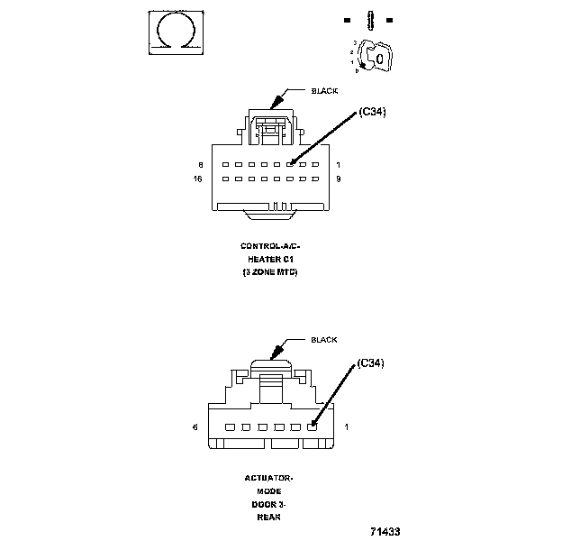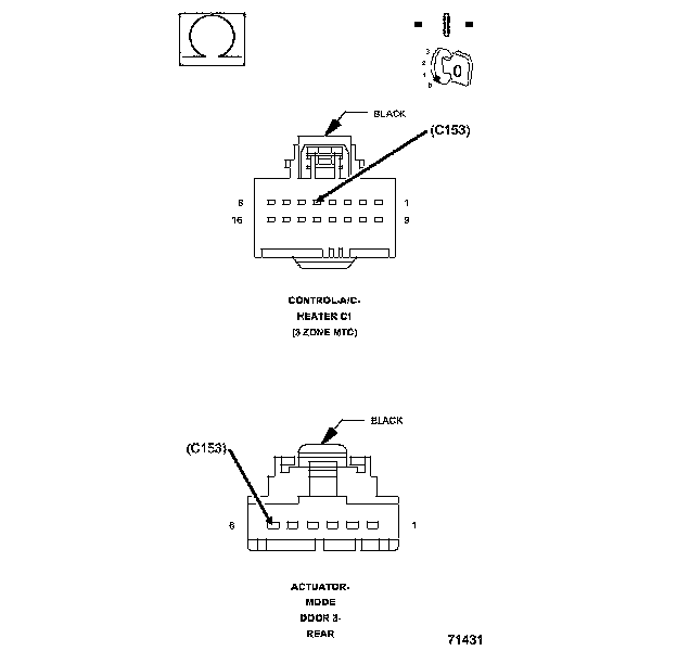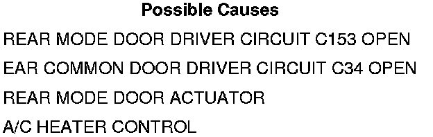The A/C heater control drives the rear mode door actuator via the rear mode door driver circuit and the rear common door driver circuit. Both of the rear door actuators share the rear common door driver circuit. In addition, the rear mode door actuator and the rear blend door actuator share a driver inside the A/C heater control. Due to the shared circuitry similar DTCs can set at the same time for multiple actuators depending upon the location of the open circuit and the direction the actuator is moving when the open circuit condition is present.
