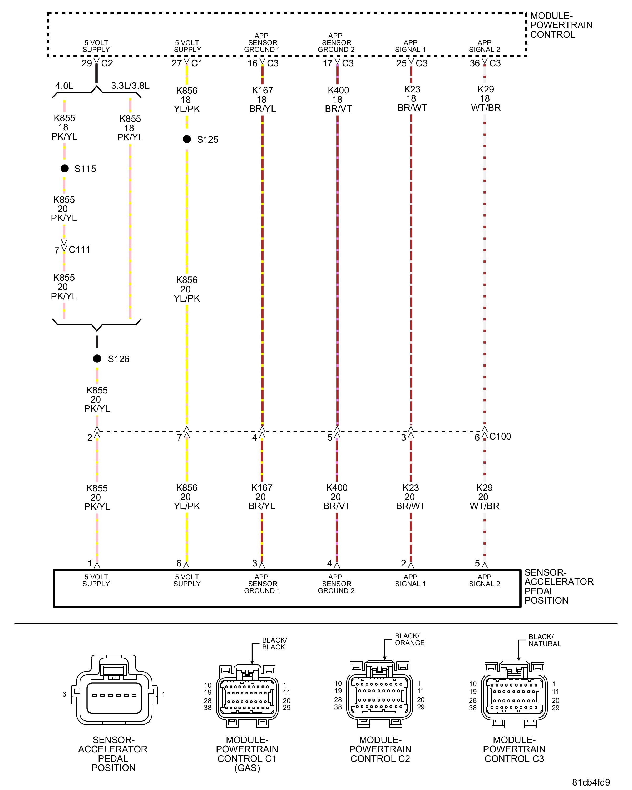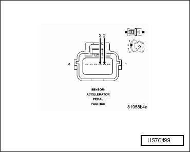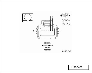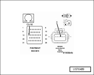 • Using the wiring diagram/schematic as a guide, inspect the wiring and connectors between the accelerator pedal position sensor and the powertrain control module.
