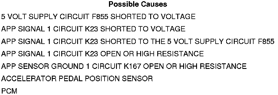 • Set Condition: The PCM detects that the accelerator pedal position sensor input voltage is more than the maximum acceptable value.