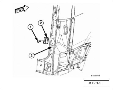 - Remove the bolt (1) that secures the liftgate bumper (2) being serviced to the D-pillar (3) and remove the bumper.