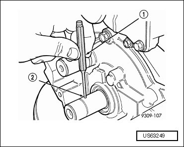- Using a small punch (1), tap the dowel pin (2) out of crankshaft.