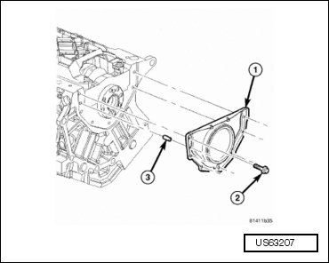 - Remove the crankshaft rear oil seal retainer bolts (2) and retainer (1).