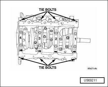 - Install the main cap tie (horizontal) bolts. Tighten the bolts to 28 Nm (21 ft lbs).
