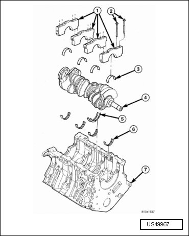 The number 2 main bearing cap must be centered over the inner bolt holes located on the block. Failure to center the bearing cap can result in contact with the crankshaft counterweights and thrust bearing failure.