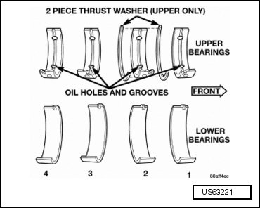 - Install the crankshaft upper main bearings in the cylinder block. Ensure that the oil holes in the bearings line up with the oil holes in the cylinder block. Refer to => [ Crankshaft Main Bearing Fitting ] Crankshaft Main Bearing Fitting.