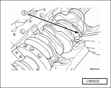 - Move the crankshaft (1) forward to its limit of travel so that the crankshaft thrust face (2) is tight against the thrust bearing.