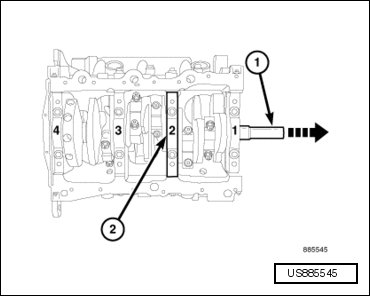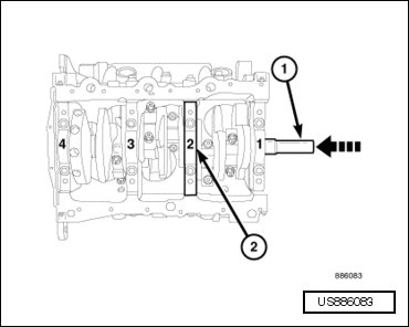 - Identify the connecting rod bearing caps before removal. Scribe a location reference mark from the number 2 main bearing cap to the engine block to use as a guide during the reassembly.