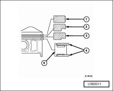 The piston rings include a moly-filled top ring (1) with a symmetrical barrel face. The intermediate piston ring (2 or 3) is of the Micro-Napier design. The Micro-Napier design has a reduced "hook" on the running face, removes the need for chroming and improves oil economy. The oil control package consists of two steel rails (4) and an expander spacer (5).