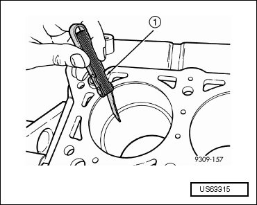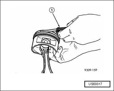 - Wipe the cylinder bore clean. Insert the piston ring and push down with the piston to ensure it is square in the bore. The ring gap measurement must be made with the ring positioning at least 12 mm (0.50 in) from the bottom of the cylinder bore. Check the gap with a feeler gauge (1). For clearance specifications, refer to => [ Piston, Pin and Ring Specifications ] [1][2]Piston, Engine.
