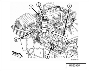 - Remove the power steering pump reservoir nut (1) and reposition the reservoir (2) aside.