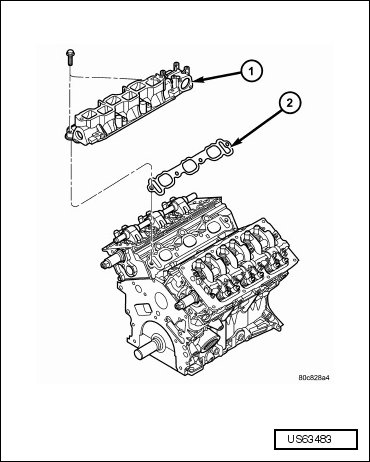 - Remove the lower intake manifold (1) and gasket (2).