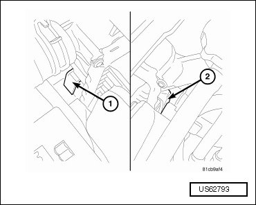 - Disconnect the shift cable (1) from the transaxle manual valve lever (2).