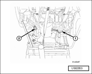 - Disconnect the heater hoses (1) and (2). Refer to => [ Quick Connect Fitting Disconnecting and Connecting ] Service and Repair.