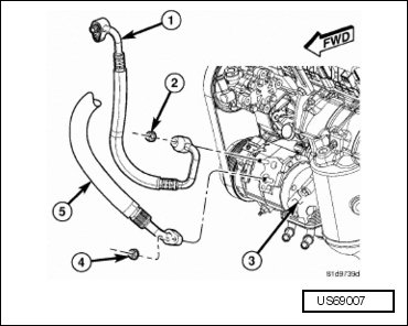- Install the A/C discharge line (1) and the A/C suction line (5) onto the A/C compressor (3).