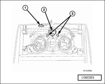 - Once the overhead console is removed, disconnect the electrical connector (1) from the light emitting diode lamp (2).