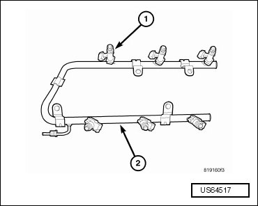 - Install the fuel injector (1) to the fuel rail (2).