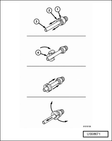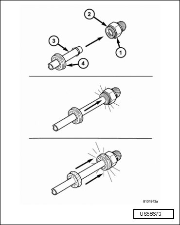 - Slide the dust cap (4) down the transmission cooler line and snap it over the quick connect fitting (2) until it is fully seated and rotates freely. The dust cap will only snap over the quick connect fitting when the transmission cooler line is properly installed.