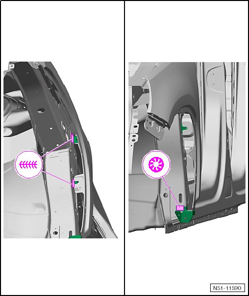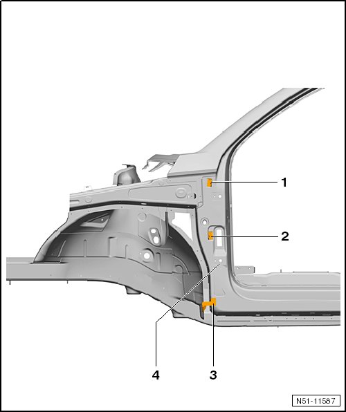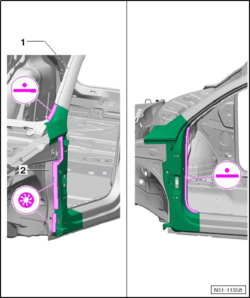 - Weld the A-pillar to the A-pillar reinforcement - 2 -, using a gas-shielded arc plug weld seam.