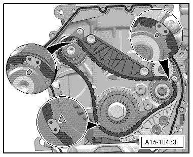 • The notch on the vibration damper must line up with the arrow mark - arrow - on the lower timing chain cover.