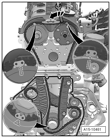 - Turn the intake camshaft using the wrench in the - direction of the arrow - and mount the timing chain. Continue to hold the camshaft with the wrench.
