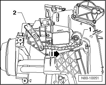 - Disengage locking mechanism - 1 - and press adjusting unit for temperature door in - direction of arrow - until it reaches stop.
