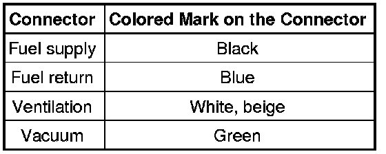 The connectors for fuel, vacuum and ventilation lines are marked with colors. There is either a colored dot on the connector or the release button is the corresponding color.