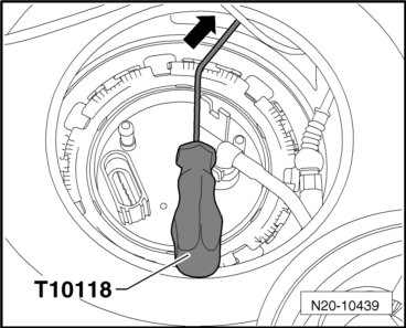 - Disengage the connector - arrow - on the fuel pump control module (J538) using the assembly tool (T10118) and remove it.