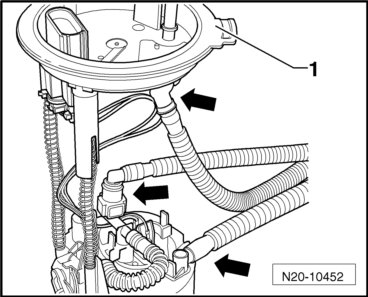 - Disconnect the fuel hoses on the delivery unit - arrows - and remove the delivery unit out of the fuel tank.