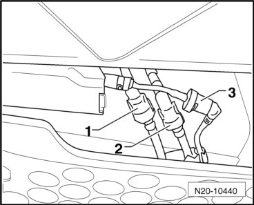 - Connect the fuel hoses - arrows -. Make sure the fuel hoses engage audibly and pull on them to make sure they are securely fastened.