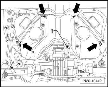 - Tighten the new bolts for the tensioning straps - arrows - and the new bolt - 1 - to 25 Nm.
