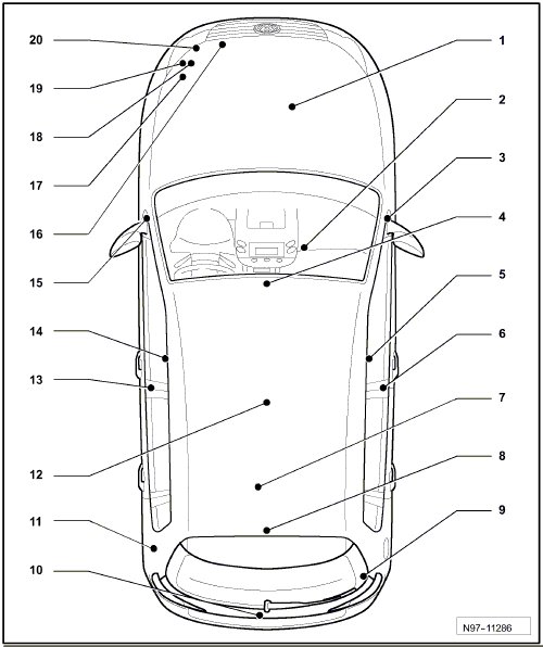 8 - Connector station on roof frame, center rear, -T2xc- , -T2aj- , -T2fm- , -T17L- , -T1h- , -T1j- , -T1c- , -T1i- , -T1e-