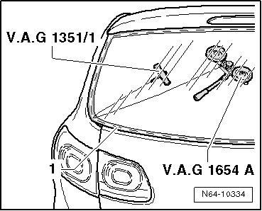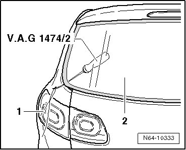 - Pull cutting cord - 1 - through adhesive sealant into vehicle interior at lower area of rear window using awl (V.A.G 1474/2) from separating device for bonded windows (V.A.G 1474 A).