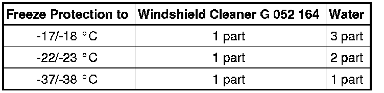 • All vehicles with fan type spray nozzles must be filled with Windshield Cleanser Concentrate (G 052 164) as this fluid has a low viscosity at minus temperatures. The complicated spray nozzle system could otherwise become blocked due to crystallized washer fluid that can affect the fan pattern of the spray nozzle. Windshield Cleanser Concentrate (G 052 164) assures that the fan type spray nozzles remain functional even at low temperatures.