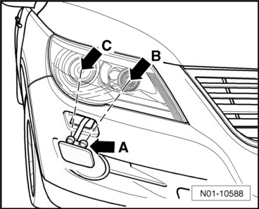- Align the nozzle spray direction with the (T10167) at the upper edge of the headlamp, - B - and - C -.