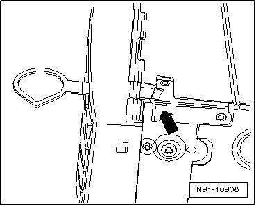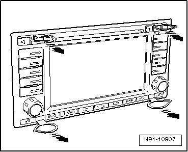 - Insert Radio Removal Tool (T10057) into release openings - arrows - until they engage.