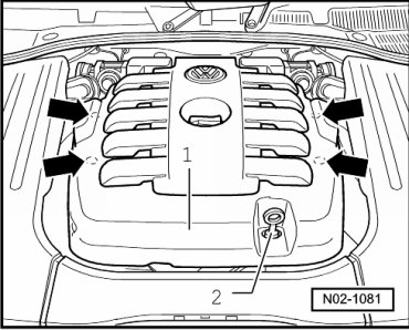 - Unclip engine compartment covers - 1 - and - 2 - and remove upward and off.