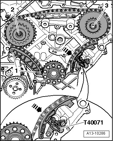 - Press the drive chain tensioner rail in the - direction of the arrow - and secure the chain tensioner using (T40071).
