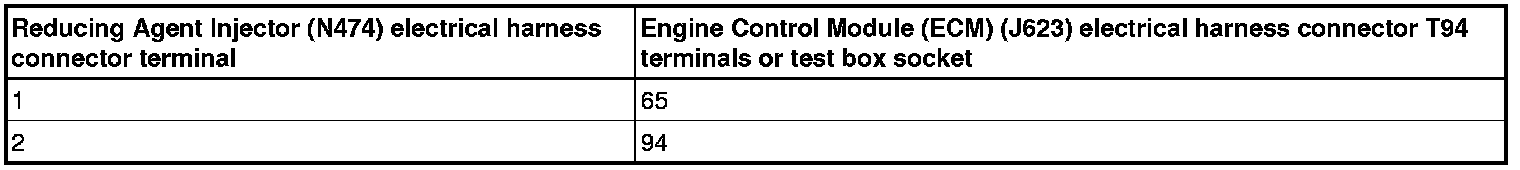 - Using a multimeter, check the Reducing Agent Injector (N474) electrical harness connector to the Engine Control Module (ECM) (J623) electrical harness T94 connector for resistance.