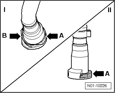- Disconnect the filling device (VAS 6277/2) and the overflow protection (VAS 6277/3) from the additive container connections, - arrows A + B -.