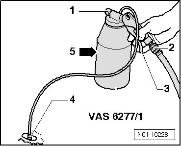 - Let filling device (VAS 6277/2) run empty so that no fluid remains in the hose or in the shut-off valve.