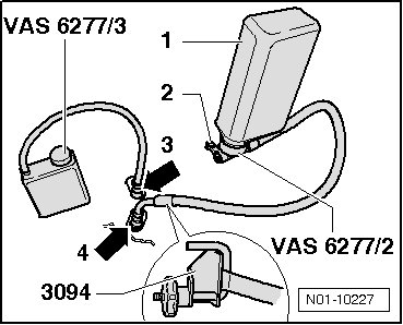 - Attach the filling device (VAS 6277/2) and the overflow protection (VAS 6277/3) with the connections - 3 - and - 4 - to the corresponding connections.