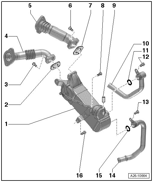 • Removing and installing, refer to => [ Exhaust Gas Recirculation Auxiliary Cooler ] Exhaust Gas Recirculation Auxiliary Cooler.