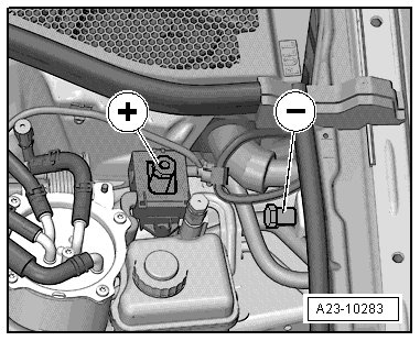 - Connect the (VAS 6395/1) and the (VAS 6395/4-2) to the positive terminal clamp "+" and to the negative terminal clamp "-".