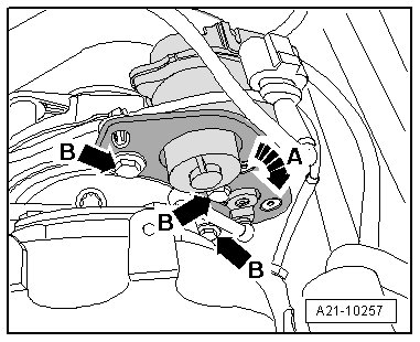 - Press the turbocharger 1 control module back and downward firmly - arrow A - while tightening the bolts - B arrows - to 10 Nm. Use the (VAS 6395/4-3) on the bolts in the center and at the bottom.